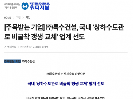 2017.08.03 | 워터저널, 국내 '상하수도관로' 비굴착 갱생, 교체' 업계 선도